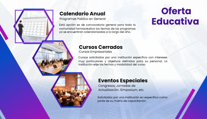 Está opción es de convocatoria general para toda la comunidad farmacéutica las fechas de los programas ya se encuentran calendarizadas a lo largo del año.